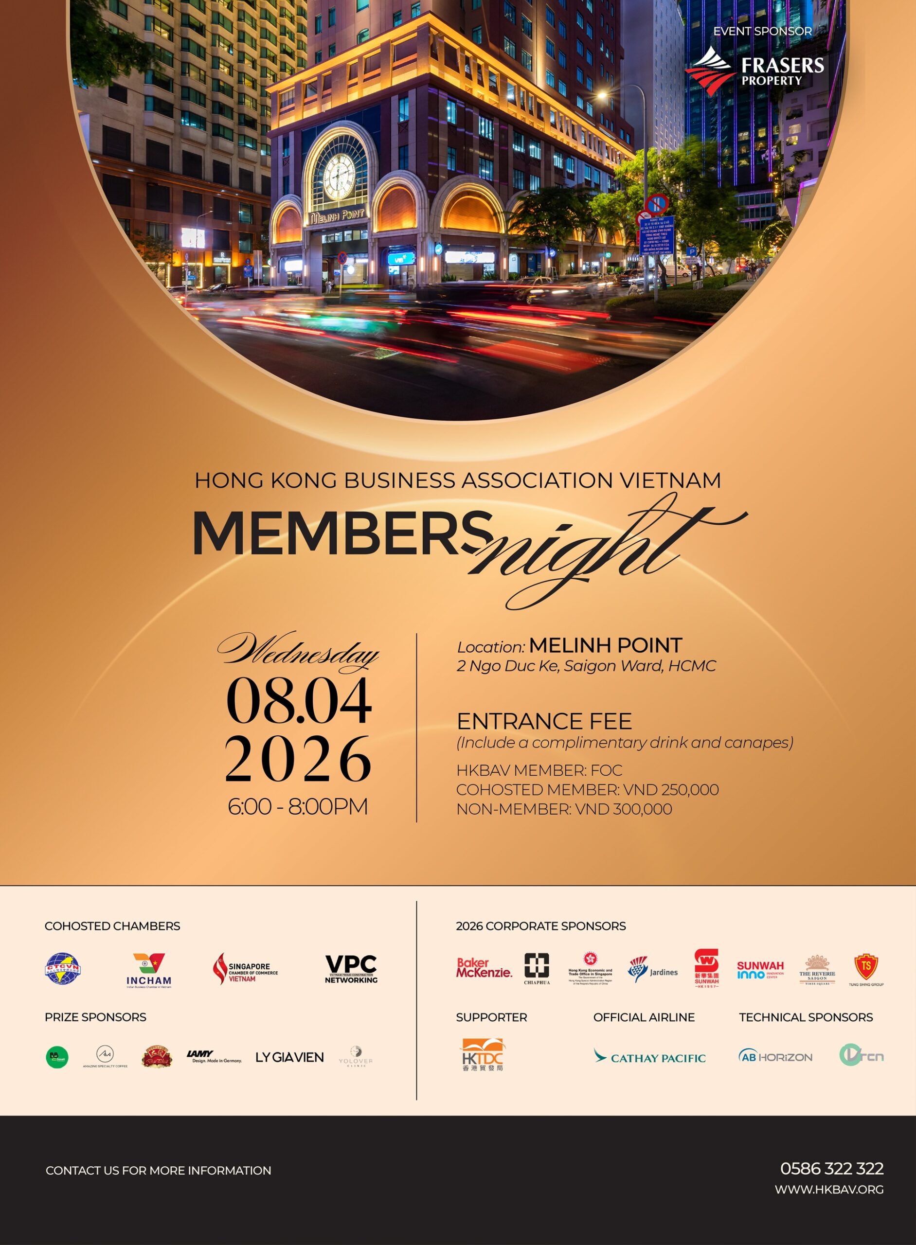 Hong Kong Business Association Vietnam (HKBAV) is delighted to inform you that upcoming HKBAV Monthly Members Night will be held with details