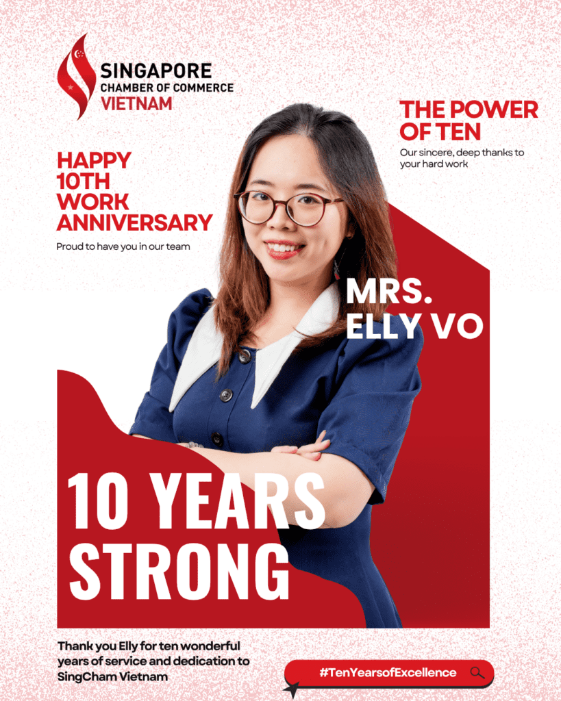Today, the Singapore Chamber of Commerce Vietnam (SingCham) takes a moment to recognize an extraordinary professional milestone. We proudly celebrate Ms. Tran Vo (Elly)’s 10th anniversary of dedicated service to our Chamber.