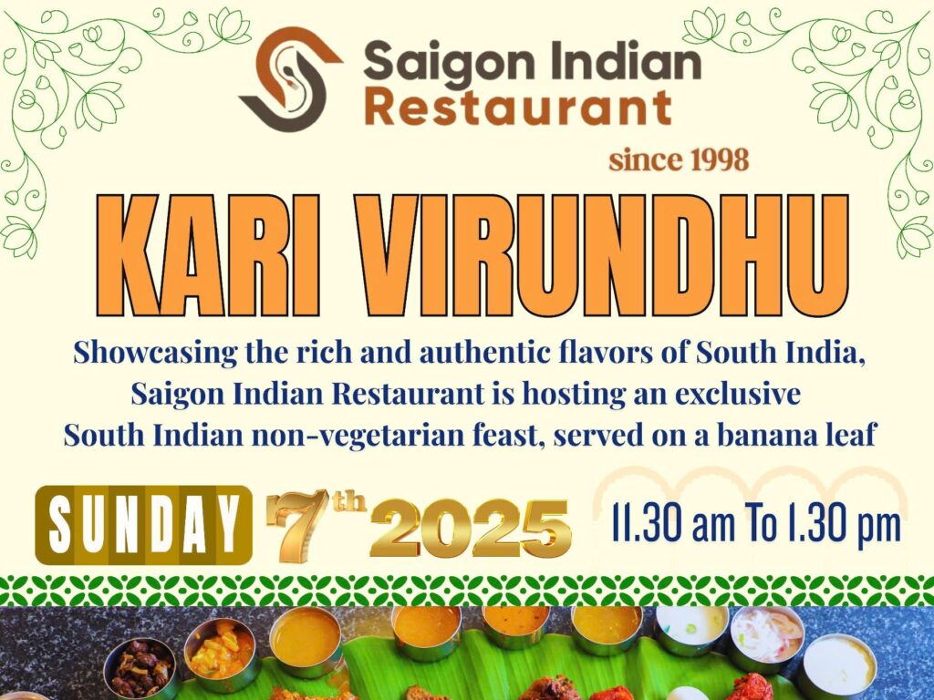 Showcasing the rich and authentic flavors of South India, Saigon Indian Restaurant is hosting an exclusive South Indian non-vegetarian feast, served on a banana leaf Event Details:Date: Sunday, December 7th 2025Time: 11:30 AM – 1:30 PM*Advanced booking required Contact us or send us an email in advance, as this leaf lunch is limited
