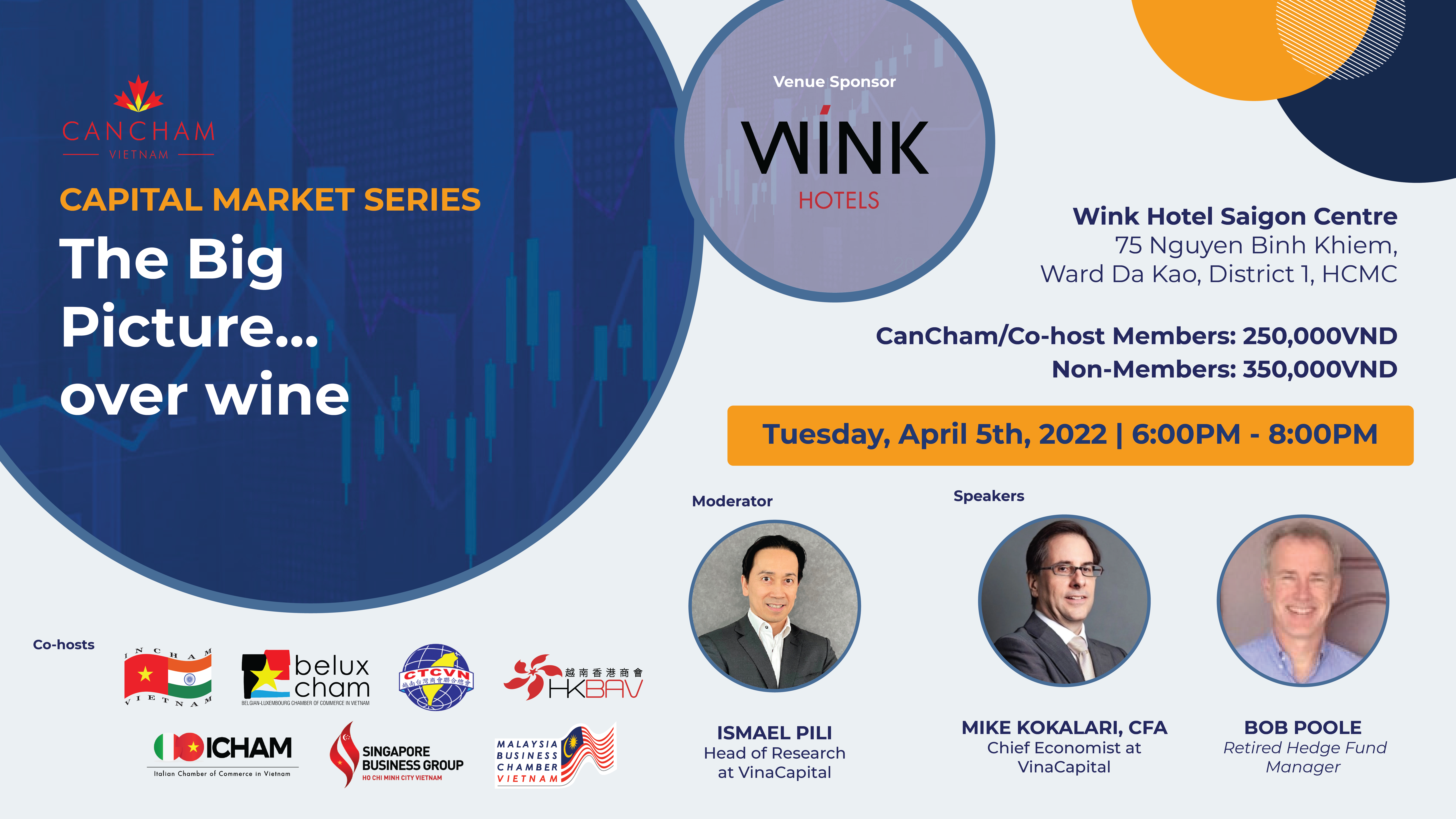 CanCham’s monthly Capital Markets Series covers different capital market topics each month. April’s event will have two leading experts discussing the macro & market situation in Vietnam. Please join us over a glass of wine (or two) at Wink Hotel Saigon, as our speakers share their insights, expectations, and predictions for Vietnam’s economy.