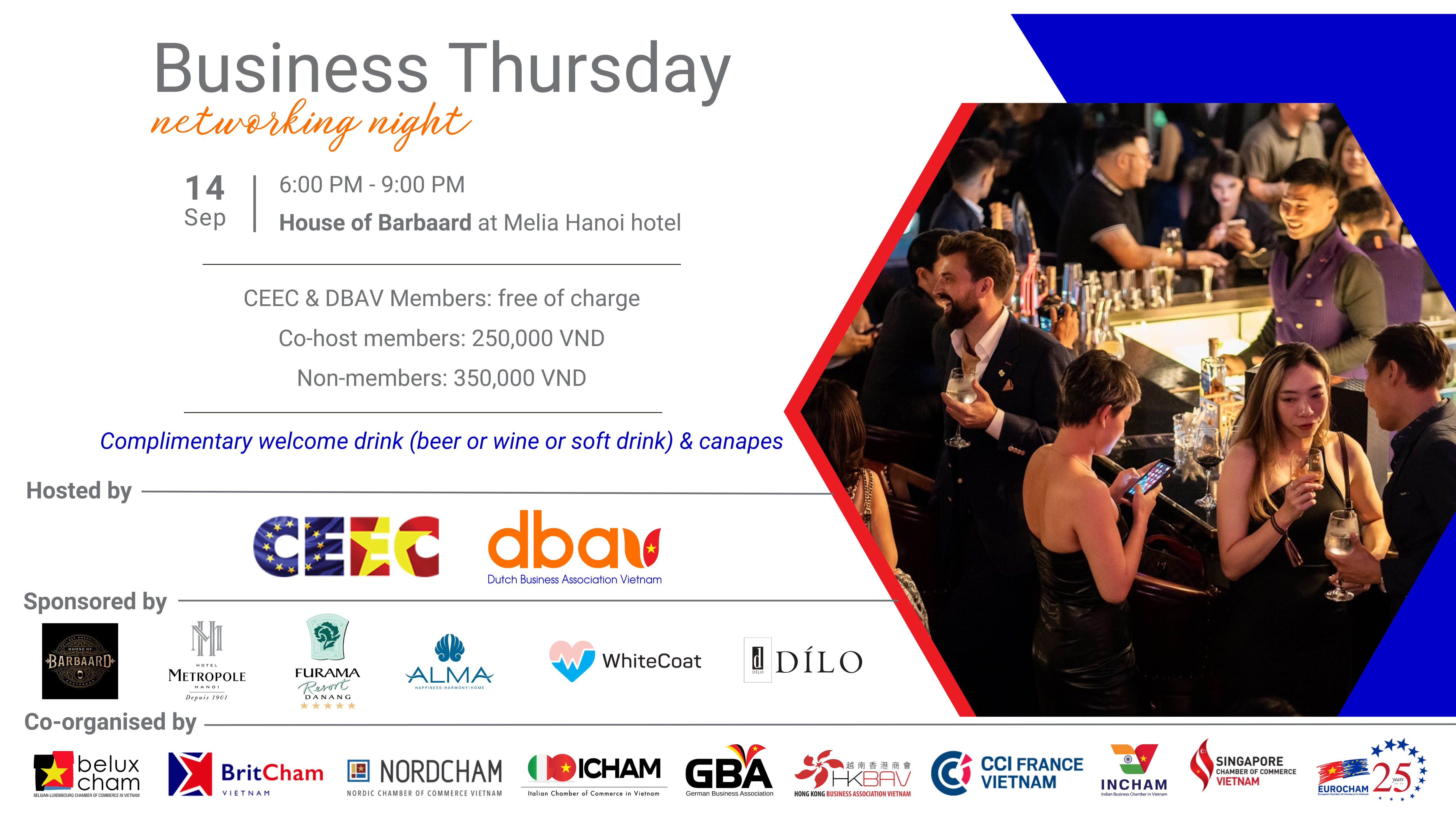 Singapore Chamber of Commerce Vietnam (SCCV) is pleased to co-host The Central and Eastern European Chamber of Commerce (CEEC) and the Dutch Business Association Vietnam (DBAV) networking event “Business Thursday”!