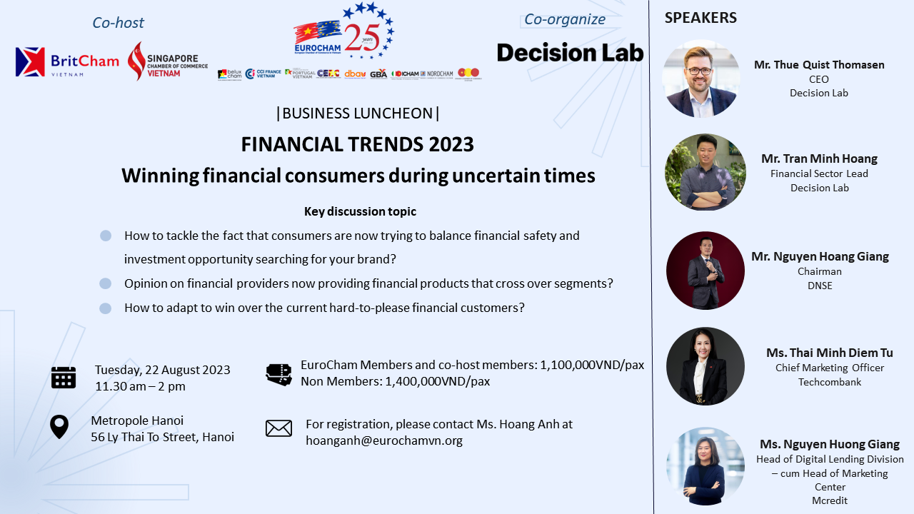 Join EuroCham and Decision Lab for an insightful seminar on”Winning financial consumers during uncertain times”. In this luncheon, we would like to share Decision Lab’s latest research on how Vietnamese consumers have adjusted their financial priorities and activities in response to the crisis and what to expect for the year ahead. This will help financial services marketers better understand consumer sentiment, behaviour, and attitudes around the evolving financial landscape to meet the ever-changing consumer demands and needs.