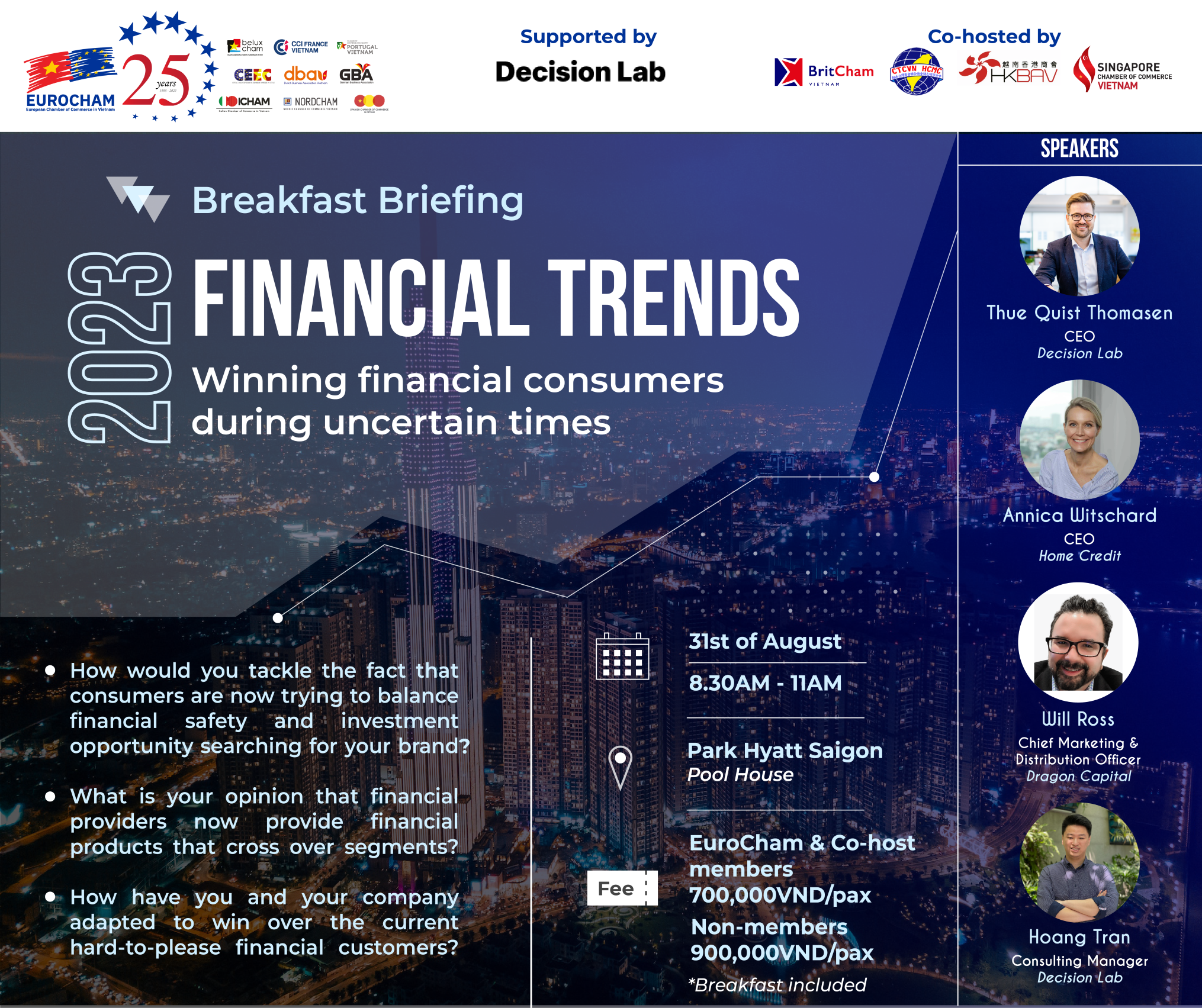 JoinEuroChamandDecision Labfor an insightful seminar on “Winning financial consumers during uncertain times”. We will share Decision Lab’s latest research on how Vietnamese consumers have adjusted their financial priorities and activities in response to the crisis and what to expect for the year ahead.