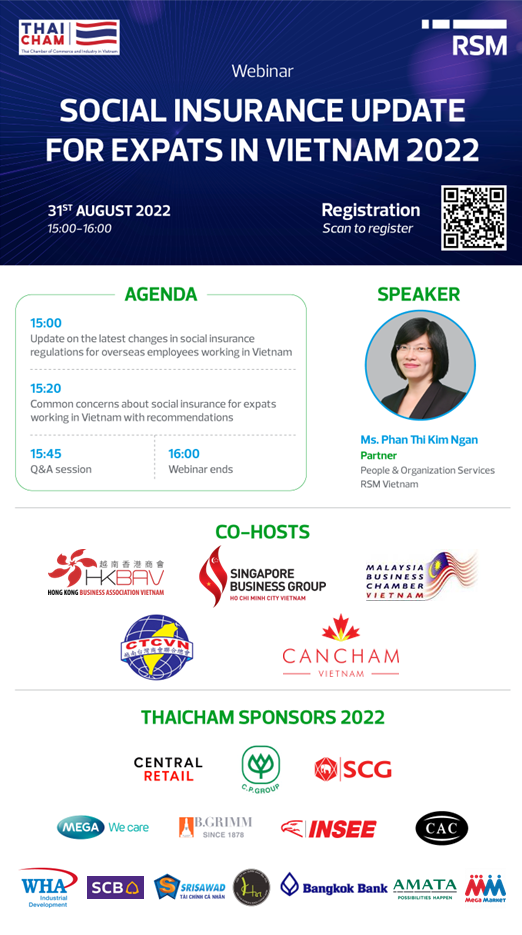 Singapore Business Group (SBG HCM) in collaboration with ThaiCham will be organizing the Webinar “Social insurance update for ex-pats in Vietnam 2022” with details as follows: