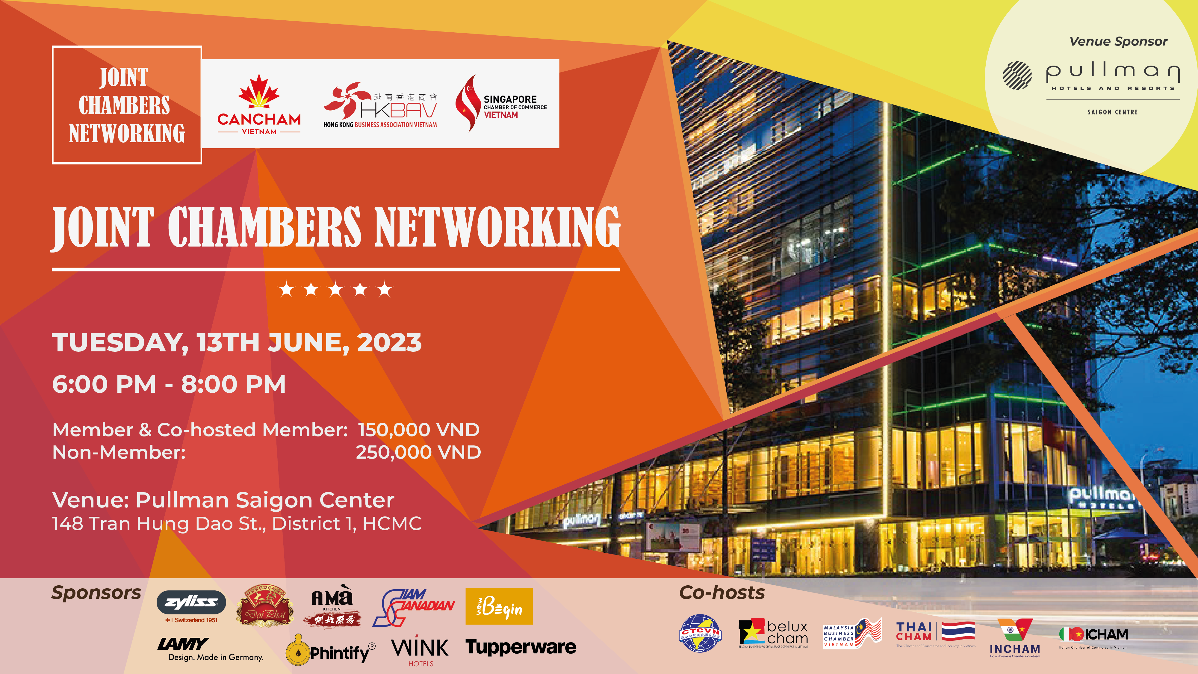 Singapore Chamber of Commerce Vietnam (SCCV), in collaboration with Canadian Chamber of Commerce Vietnam (CANCHAM) and Hong Kong Business Association Vietnam (HKBAV), will be organizing the “JOINT CHAMBERS Networking Event” in the heart of Saigon: