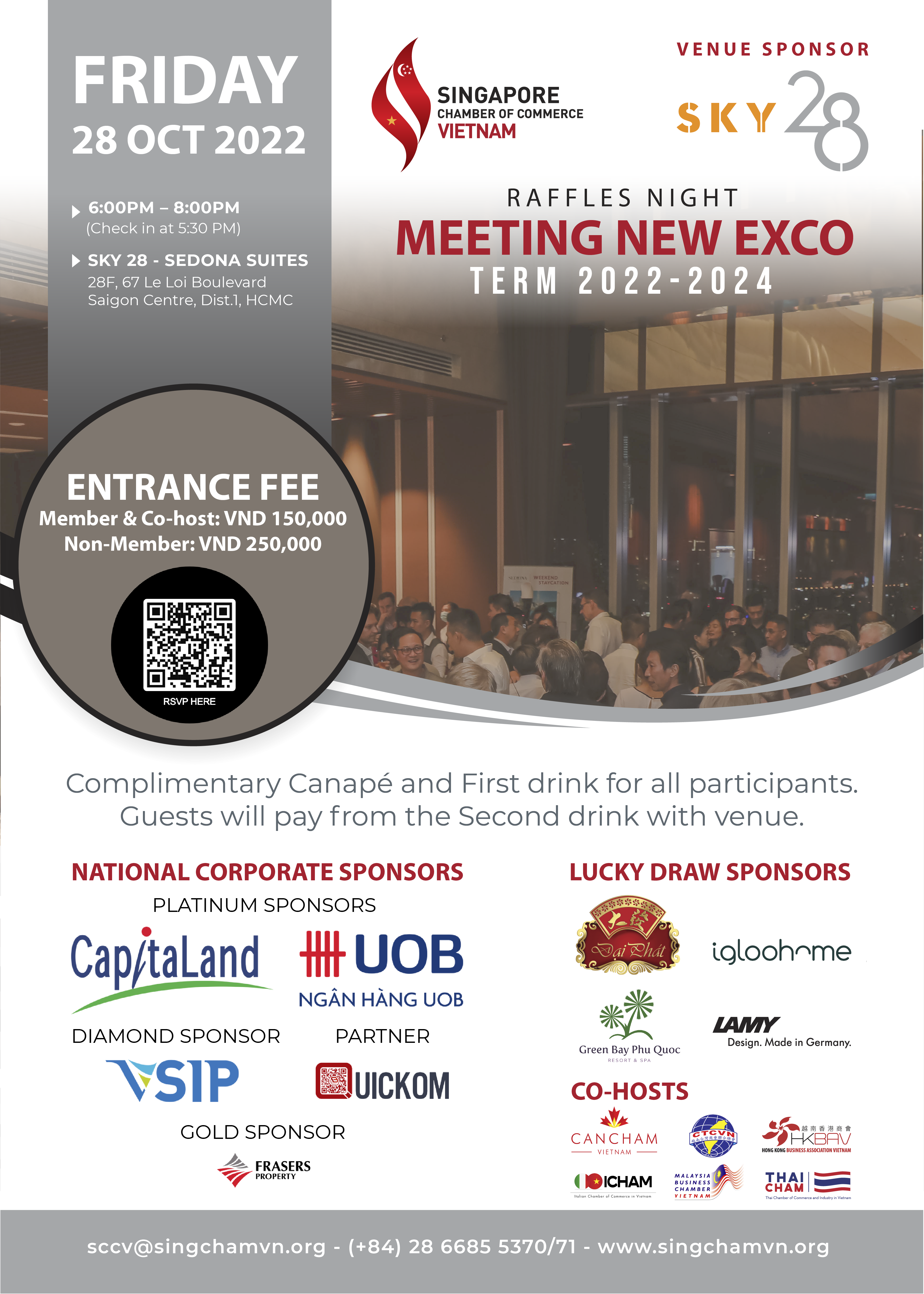 Singapore Chamber of Commerce Vietnam (SCCV) will be organizing the Raffles Night Networking Event: “Meeting New Exco Term 2022 – 2024”. This would be the first Raffles Night since the new name Singapore Chamber of Commerce Vietnam was published officially. This a special occasion for SCCV Members to meet and greet newly elected Executive Committee Members, and Nominated Executive Committee Members of Term 2022 – 2024, who will altogether make the Singapore Chamber of Commerce Vietnam a greater and stronger community.