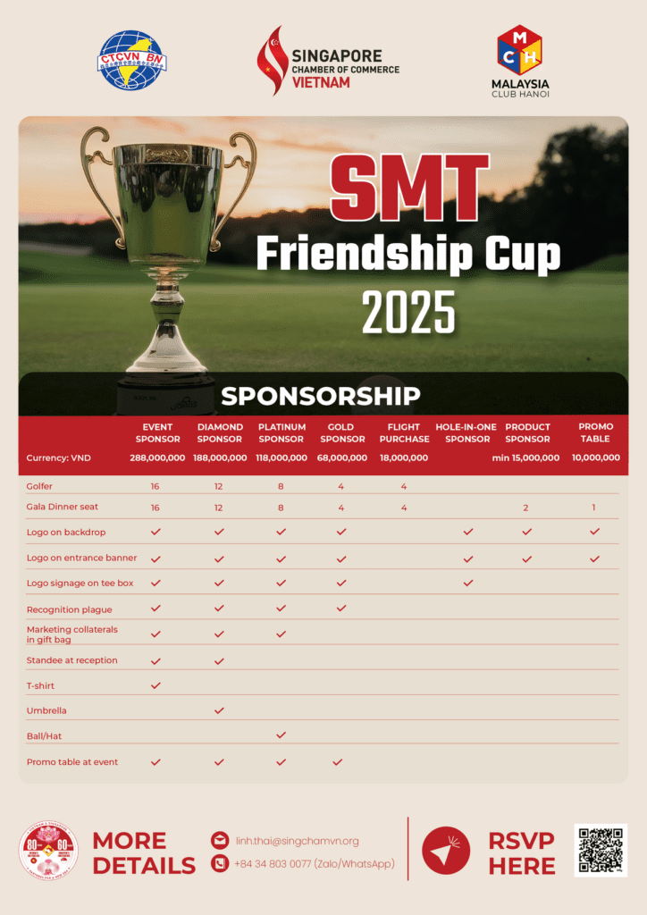 This year, SingCham Vietnam proudly hosts the tournament as part of Singapore’s 60th National Day celebrations. Beyond the greens, it is also a valuable platform for sponsors to showcase their brand to C-level executives, industry leaders, and regional partners.